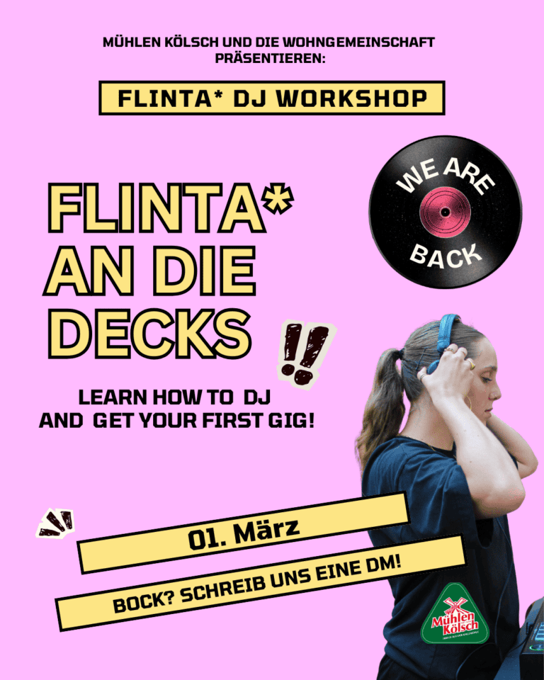Mit den FLINTA-DJane Workshops werden konkrete Räume geschaffen, in denen Frauen professionell an das DJ-Handwerk herangeführt werden. Die Workshops finden regelmäßig im Zwei-Monats-Rhythmus in der Wohngemeinschaft statt. Geleitet werden sie in Kooperation mit dem Kölner DJane-Kollektiv E.P.I.Q., das für Soul, Hip-Hop und R&B bis zu House, Breakbeats und UK Garage steht.